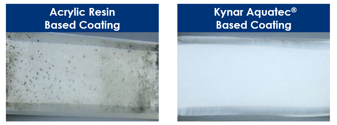 Kynar Aquatec® PVDF 树脂有助于防止霉菌生长。 在以下示例中,相较于丙烯酸涂层,经过佛罗里达州南部19个月的风化测试,Kynar Aquatec® PVDF树脂基涂层依旧保持清洁。 两种涂料均未添加杀菌剂,展示出 Kynar Aquatec® PVDF 树脂涂料具有防霉抗菌的性能。